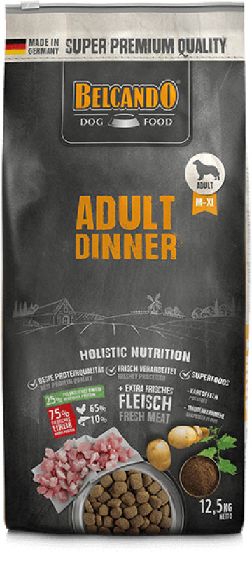 From 1 year of age Large croquettes Protein 23% – Fat 10.5% Holistic dry food Normal activity levels, Careful selection of raw ingredients, plenty of tender poultry, healthy potatoes and cold-pressed grape seed flour give BELCANDO ADULT DINNER the ideal combination of nutrients for adult dogs. The limited content of protein and fat is adapted to the requirements of dogs with normal activity levels.If the right quantity is fed, the dog’s body weight will remain constant and the satiety level will be appropriate.The larger croquettes encourage the dog to chew